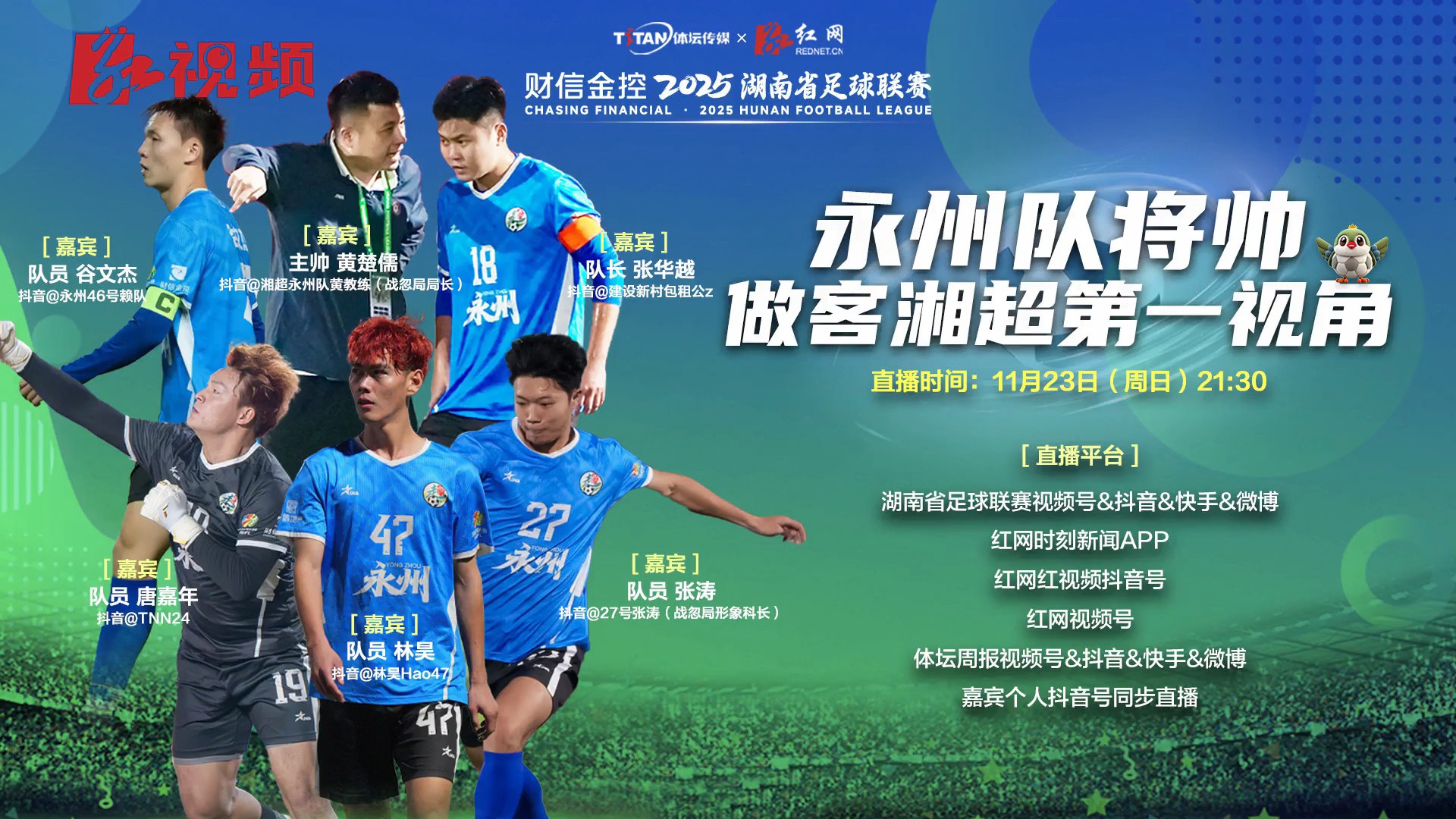 今晚21:30,湘超常规赛第十一轮赛事全部结束后,永州队主教练黄楚儒将率队长张华越,队员谷文杰、林昊、张涛、唐嘉年做客红网演播中心,畅聊湘超开赛至今最大黑马在最“野”球场上演的精彩故事。本场直播由体坛传媒&体坛周报总编辑、金球奖中国评委骆明和体坛周报撰稿人、湘超解说员周佳骅联袂担纲主持。网友们可通过红网时刻新闻APP、红网红视频抖音号、红网视频号等平台观看直播并参与实时互动。
