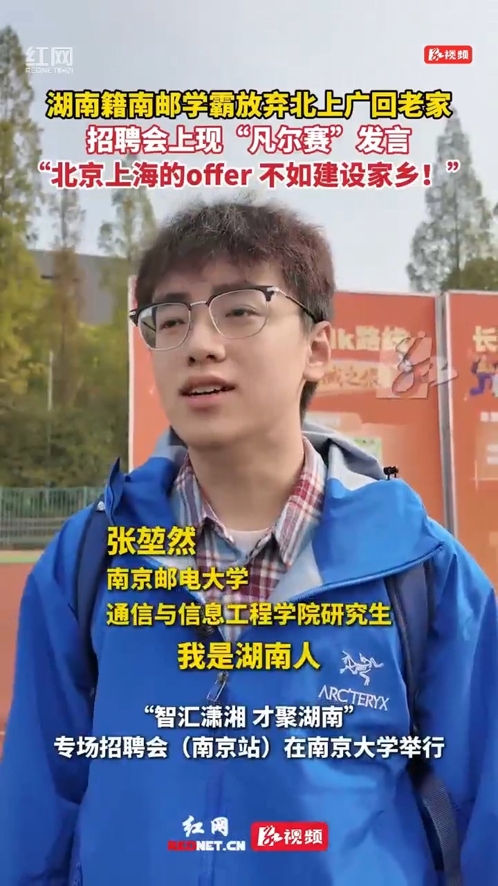 红网时刻新闻11月1日讯(记者 殷铭康 王婷婷 张珍 李静怡)11月1日,“智汇潇湘 才聚湖南”专场招聘活动走进古都南京,向广大学子发出“来湘留湘”的诚挚邀约。来自南京邮电大学通信与信息工程学院的研究生张堃然早早地来到了现场,他坦言,听说了家乡的这次招聘活动,很是期待。在他看来,北京上海的offer,不如建设家乡!他惊喜地表示,“招聘现场规模超大,还贴心准备了零食,超暖心!”一场跨越千里的人才之约,不仅是一次简单的就业选择,更是一场游子与故土的双向奔赴。