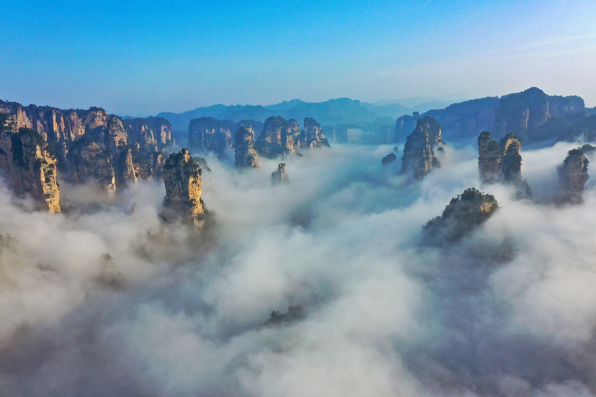 有的峰峦孑然独立,似利剑刺破苍穹;有的群峰相拥,如神兵列阵待发。石英砂岩的肌理在晨光下泛着古朴的黄褐,岩顶的绿植却透着鲜活的生机,与缥缈云海、澄澈蓝天交融,勾勒出一幅兼具雄浑与空灵的山水长卷,尽展自然遗产的超凡魅力,让每一位凝望者都沉醉于这天地共绘的奇绝景致。(图、文、视频/周建鑫)