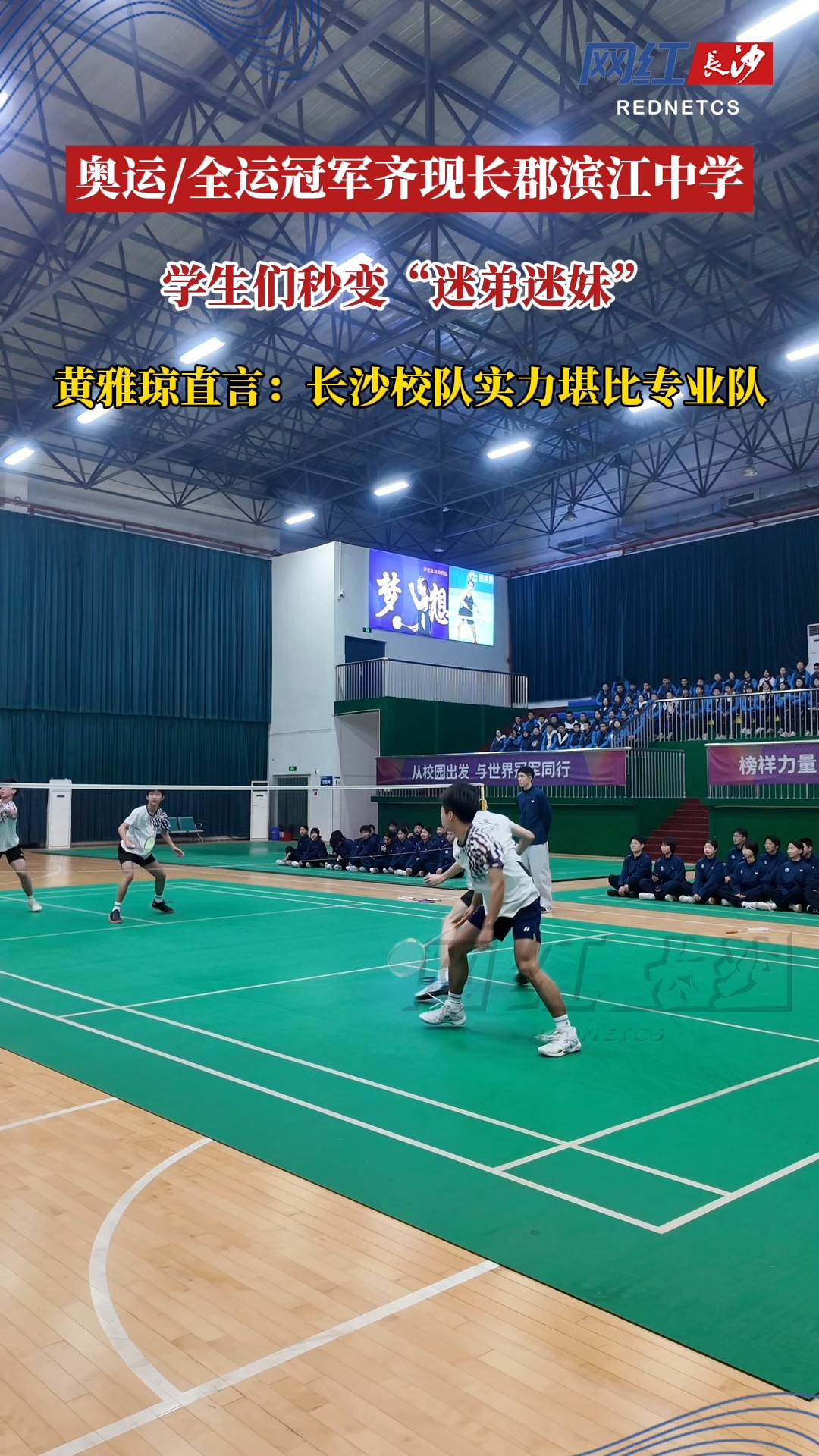 活动中,长郡滨江中学羽毛球队的队员们进行了一场高水平的训练展示赛。冠军运动员们在场边认真观赛,气氛热烈。赛后点评环节,黄雅琼表示:“我觉得校队队员的水平,其实和我们专业运动员水平比较像的。”这句高度评价极大地鼓舞了在场的每一位小球员。随后,王祉怡、张弛等冠军运动员更是亲自上场,与在展示赛中表现出色的队员进行了一场别开生面的短局交流赛。