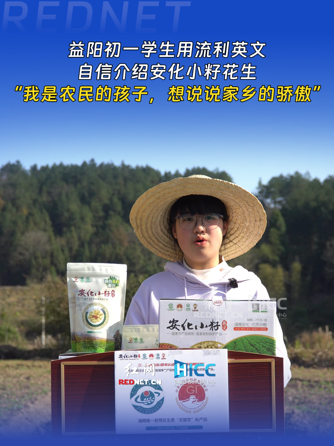 益阳安化初一学生用流利英文为家乡特产“安化小籽花生”代言,以自信风采助力家乡特产香飘世界。A seventh grader from Anhua, Yiyang,promotes her hometown's specialty — Anhua Small-Seed Peanuts — in fluent English,with her confident charm to share this local treasure with the world.