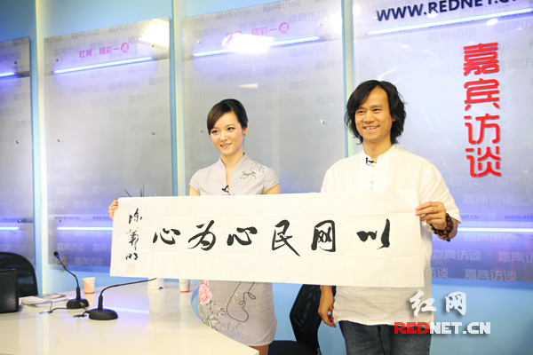 小婧:今天在现场我们也布置了一个小小的书桌,虽然没有香,但是我们也布置了一个干净整洁的桌面。是否今天有这个荣幸,请我们陈老师给红网网友写一幅字好吗?