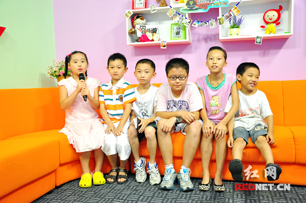 子文:那么6位非常可爱,今天一来到我们的访谈间就乐开了花,当然了我们今天也要你们一一来介绍一下自己,好不好?也许很多的阿姨叔叔在电脑前收看你们的视频,曾经在你们的手上买过一份晨报呢。所以说现在赶紧跟大家介绍一下自己好不好?我看到一位小朋友已经拿起了话筒了,那我们逐个介绍一下,你叫什么名字?