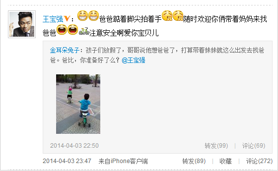 随后,王宝强转发微博并欢迎老婆带一双儿女探班,称:“爸爸踮着脚尖拍着手随时欢迎你俩带着妈妈来找爸爸,注意安全啊!爱你宝贝儿!”